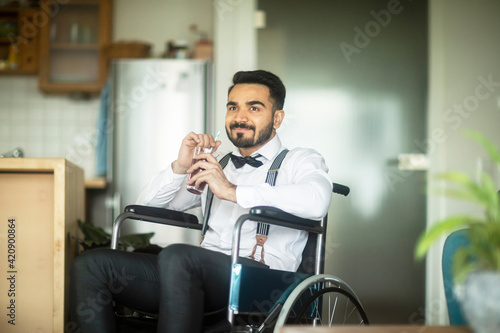 enjoyment, achievement, ambition, home, balance, bow tie, calm, chance, day, disability, drinking, independence, indoor, looking away, male, man, mobility, one person, opportunity, pensive, portrait, pride, refresh, relaxation, satisfaction, serene people, shirt, sitting, soft focus, success, support, thirst, thought, wearing, wheelchair, young men, thinking, asian ethnicity, young adult, man, young men, aspiration, mood, refreshment, thirsty, disabled, selective focus, attaching, symbol, numeral, domestic life