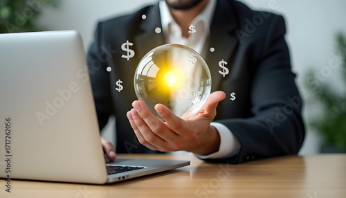 finance, business, investment, forecasting, prediction, future, success, wealth, money, dollar, crystal ball, vision, strategy, planning, growth, market, financial, analysis, concept, opportunity, risk, profit, economy, global, businessman, suit, laptop, technology, office, desk, hand, holding, glowing, light, digital, online, workspace, working, career, management, leadership, corporate, professional, achieve, goal, target, visualisation, symbol, abstract