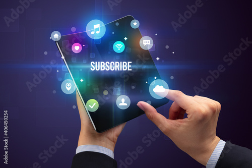 Businessman holding a foldable smartphone with SUBSCRIBE inscription, social media concept