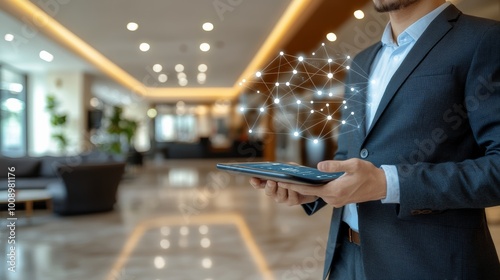Businessman holding a tablet with a digital hologram of business icon on a blurred background