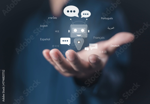ai, robot, bot, language, global, translate, speech, talk, chat, digital, communication, tech, artificial, intelligence, modern, business, datum, system, smart, online, future, connect, service, message, dialogue, innovation, interactive, automation, technology, translation, network, learning, hand, globe, concept, computer, design, web, virtual, software, assist, creative, futuristic, machine, support