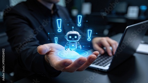 Businessman holding holographic chatbot assistant with alert icons,artificial intelligence customer support automation and problem solving technology in modern office environment