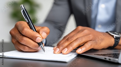 man, woman, male, female, writing, pen, notepad, business, meeting, office, work, professional, document, paperwork, desk, table, strategy, planning, communication, corporate, executive, formal, attire, device, laptop, technology, success, goal, sharpened, concentration, teamwork, collaboration, discussion, presentation, paper, stationary, workspace, copy space, space