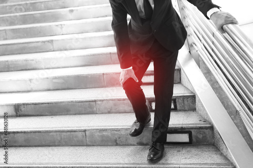 Businessman in a suit have the sore pain and painful knee problem expression and walk up and down on the stairway during go to office. Health care concept.