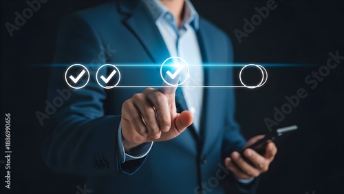 Businessman in a suit selecting option on digital touchscreen interface with checkboxes