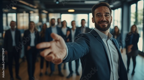 Businessman in a suit Stretch out your hand to welcome Welcome to the group. with a team behind him in the office