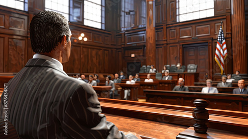 Businessman in Courtroom with American Flag During Trial Jury Justice System Legal Proceedings Litigation Lawsuit Lawyer Litigation Lawyer Business Law Courtroom