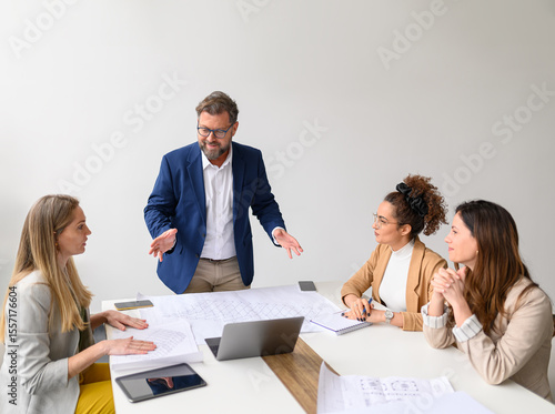 Businessman in eyeglasses discussing project blueprints and planning with female colleagues in office during meeting