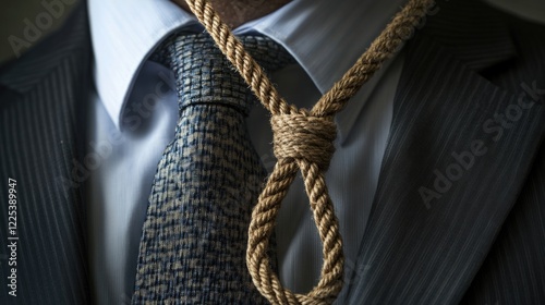 businessman, formal, attire, noose, rope, attaching, symbolism, economic, issue, despair, corporate, environment, stress, anxiety, crisis, finance, metaphor, struggle, unemployment, burden, pressure, challenge, society, men at work, office, leadership, innovation, survival, capitalism, downturn, negative, job, salary, bankruptcy, tension, outlook, pessimism, image, concept, visual, problem, industry, representation, male, adult, serious, conflict
