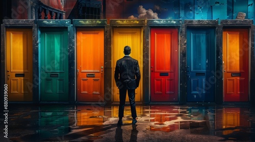 businessman in front of multiple doors of diverse colors as symbol for different opportunities. Generative ai