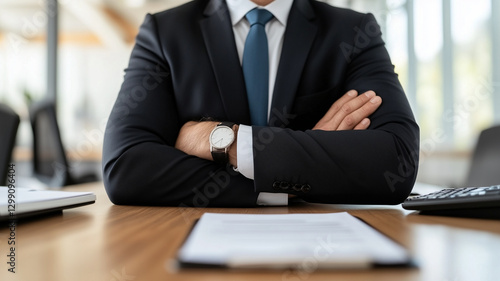 businessman, suit, office, desk, arm, crossed, professional, confidence, authority, corporate, watch, document, workspace, serious, male, business, meeting, negotiation, modern, executive, leadership, strategy, planning, success, career, attire, formal, setting, table, communication, sharpened, organisation, productivity, teamwork, collaboration, technology, finance, industry, management, presentation, analysis, culture, environment, professionalism, work, space, expression