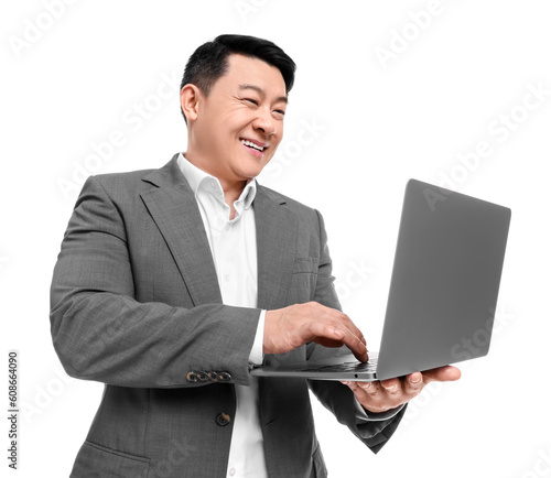 adult, apparel, asian, background, business, businessman, clothes, clothing, coach, computer, device, elegance, elegant, fashion, formal, garment, grey, happy, cyberspace, isolated, jacket, job, laptop, male, man, model, office, outfit, person, portrait, pose, posing, profession, shirt, smiling, studio, stylish, success, suit, surfing, technology, trend, trendy, using, wear, web, white, men at work