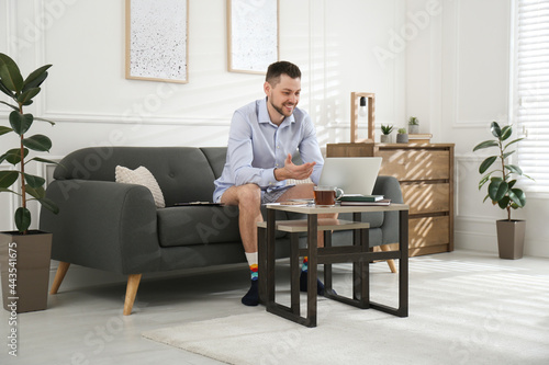 shirt, background, house, adult, indoor, person, business, home, room, male, man, caucasian, work, working, businessman, social, distance, quarantine, modern, technology, computer, laptop, notebook, living, sofa, couch, video, call, classic, clothes, formal, wear, pretending, manager, table, happy, smiling, cyberspace, online, funny, communication, corporate, meeting, connection, conference, humor, freelance, underclothing