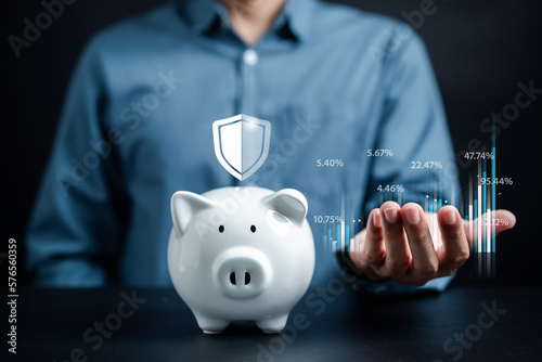 Businessman investment and saving money for protection, planning in future with piggy bank for increase financial interest rate and business investment growth from dividend, Business Finance and Money