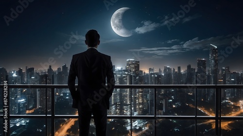 Businessman looking and enjoying the night view from balcony with busy urban downtown with loneliness for solitude, business, inspiration and dreaming of freedom lifestyle concept