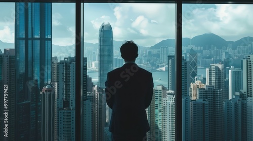Businessman looking out the window at a city skyline. Concept of leadership, business, and urban life.