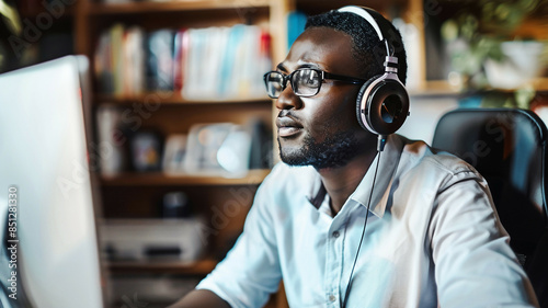 Businessman of African descent, wearing headphones, studying online webinar, focused expression, professional workspace, detailed, bright lighting