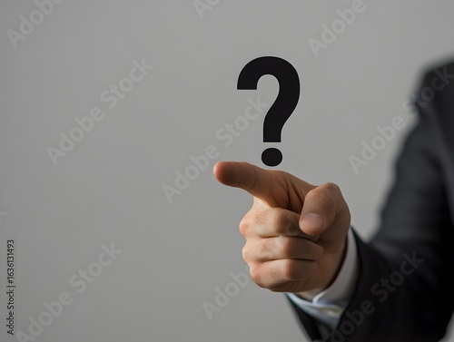 question, mark, pointing, finger, hand, businessman, business, uncertainty, doubt, query, researching, problem, solution, questioning, answer, help, support, guidance, direction, choice, decision, future, strategy, planning, thinking, concept, idea, background, grey, closeup, hand gesture, man, suit, professional, corporate, office, digital, virtual, interaction, technology