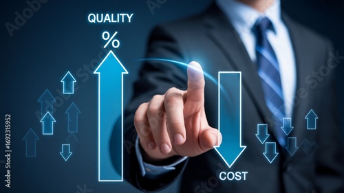 business, growth, success, finance, strategy, management, performance, improvement, efficiency, cost, quality, percentage, graph, chart, datum, digital, technology, screen, interface, businessman, suit, attaching, pointing, finger, upward, arrow, downward, blue, dark, concept, progress, development, investment, profit, revenue, marketing, sale, economy, financial, corporate, presentation, report, statistic, trend, increase, decrease