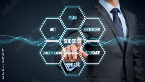 Businessman points to success factors: plan, courage, optimism, feedback, act