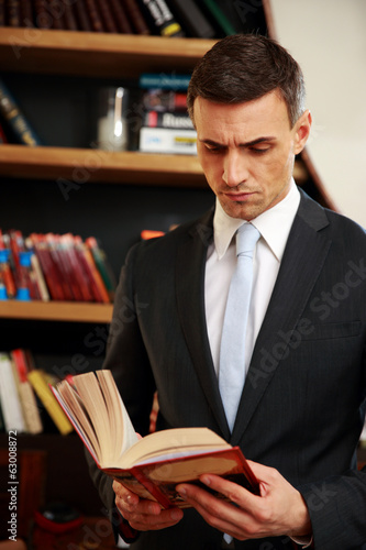 bookshelf, education, vertical, reading, book, business, man, male, businessman, suit, black, attaching, brunette, standing, intelligent, smart, successful, holding, serious, professional, job, work, men at work, entrepreneur, lawyer, looking, photogenic, boss