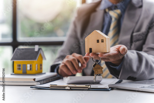 Businessman realtor with house model, sitting at desk, real estate agent manager working on documents, mortgage and property.