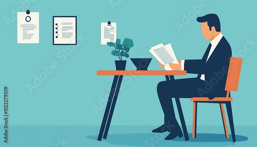 businessman, office, desk, chair, document, reviewing, paper, analysing, work, business, professional, suit, attaching, blue, teal, orange, white, black, flat, illustration, graphic, design, minimalist, simple, modern, isolated, background, interior, workplace, corporate, meeting, analysis, strategy, sharpened, serious, concentration, thoughtful, task, reading, research, planning, project, datum, report, contract, agreements, information, cognition