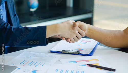 Businessman shaking hands during a meeting in the office, Successful businessmen handshaking after good deal. Horizontal, blurred background