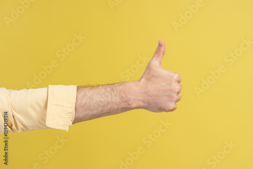 thumb, up, hand, gesture, yellow, background, positive, approval, success, agreements, encouragement, like, good, ok, well, done, excellent, business, businessman, professional, office, work, career, communication, body language, non, sign language, verbal, symbol, signs, human, arm, male, man, person, acceptance, support, motivation, feedback, recommend, satisfaction, optimistic, yes, correct, right, honed, great, cool, awesome