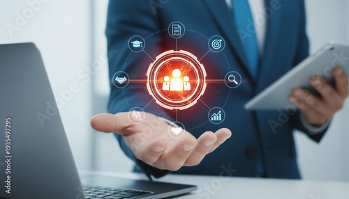 business, human, resource, hr, management, teamwork, leadership, people, success, growth, development, strategy, planning, target, goal, vision, mission, company, corporate, career, employee, recruitment, training, education, skill, performance, evaluation, support, collaboration, innovation, future, technology, digital, virtual, screen, interface, hand, person, male, man, professional, suit, tablet, laptop, office