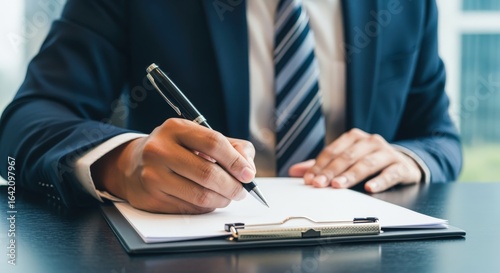 Businessman signing a contract on a clipboard at his desk, symbolizing agreement and professionalism in the workplace