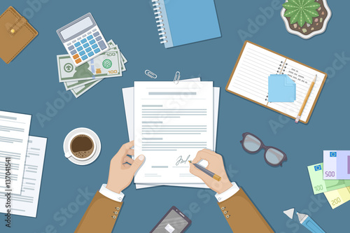 Businessman signing a document. Man hands with pen and contract. The process of business financial agreement. Document with a signature. Desk with money purse notebook. Vector illustration top view