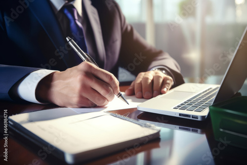 Businessman signing important documents behind a desk with a laptop, close up view.generative ai