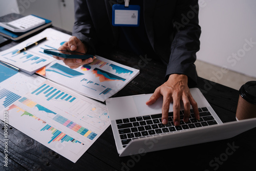 businessman sits at his office desk, analyzing financial documents and graphs on his laptop. paperwork, calculator, and charts, he strategizes investments, audits, tax planning for success.