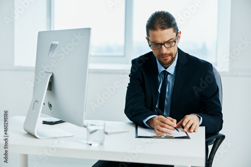 businessman sitting at a desk in front of a computer technologies