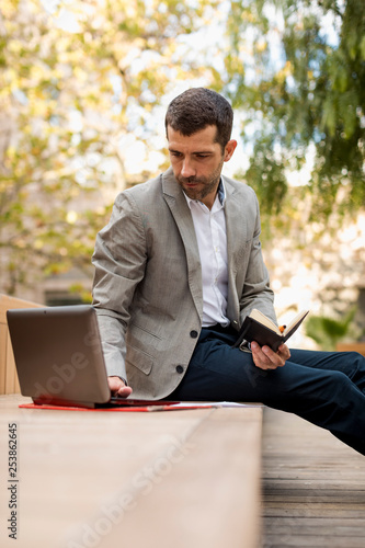 businessman, sitting, bench, laptop, diary, business, people, computer, entry, spain, freelancer, smart, wi-fi, schedule, date, notebook, caucasian, alone, 1, mid, adult, man, wooden, wireless, outdoors, terrace, connection, urban, online, mobility, elegant, cyberspace, working, day, technology, independence, lifestyle, accessibility, convenience