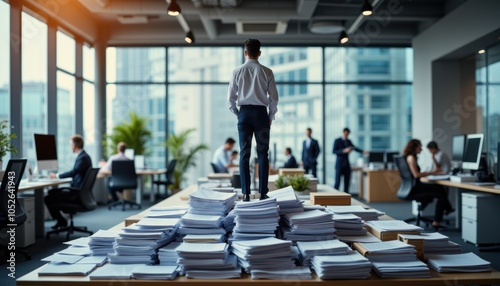 Businessman standing on desk with stacks of papers in modern office, difficulties at work concept