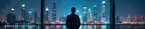 Businessman stands in front of sleek skyscraper with futuristic cityscape at night, skyscraper, architecture, futurism