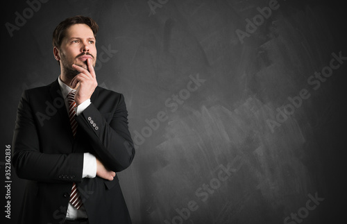 businessman thinking about something in front of a blackboard