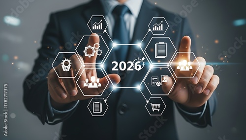 Businessman touching a futuristic interface displaying the year 2026 with various business icons and network connections