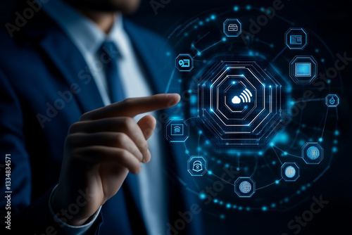 Businessman touching icon and exploring the potential of Artificial Intelligence to enhance business operations, improving efficiency, reducing costs, and driving innovation across various industries