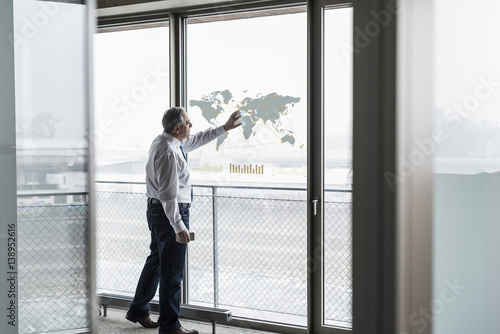 Businessman touching windowpane with world map in office