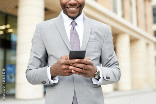 adult, adults only, business, businessperson, businessman, african ethnicity, cheerful, city, city life, communication, confidence, connection, copy space, happiness, holding, cyberspace, lifestyle, looking, male, manager, man, mobile phone, modern, occupation, one man only, one person, outdoors, people, portrait, professional occupation, smiling, standing, success, suit, technology, phone, text messaging, touch screen, well-dressed, wireless technology, young adult