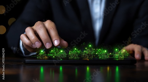 Businessman Typing on Keyboard with Green Digital Elements Displayed