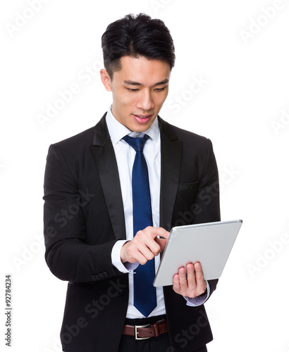 man, guy, male, boy, japanese, korean, chinese, asia, asian, china, taiwanese, colleague, supervisor, business, businessman, suit, leader, banker, accountant, teacher, officer, use, surfing, touch, type, hold, watch, tablet, digital, portable, pad, contraption, isolated, white, background, people, person, portrait, 1, young, adult, mature, photogenic, gentleman, smile, happy, computer, electronic