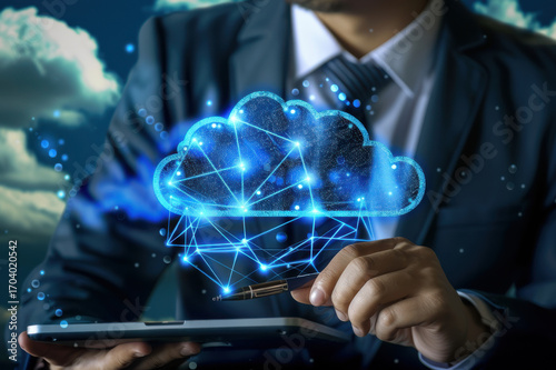 Businessman using a digital tablet with a holographic cloud network, symbolizing cloud computing and data connectivity.