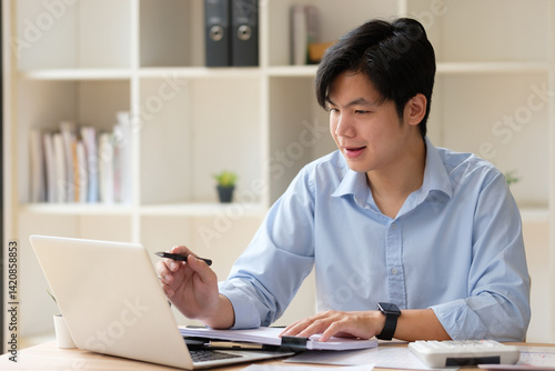 Businessman using laptop and planning business strategy at office desk.