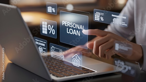businessman using laptop with a virtual transparent "personal loan" digital interface, online loan application, fintech, virtual finance