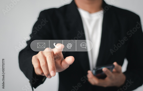 Businessman using smart phone and touching on virtual screen contact icons Contact us or Customer support hotline people connect. ( email, telephone, address, live chat,).