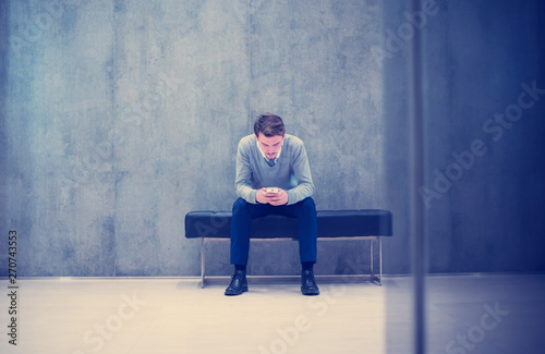 young, businessman, using, smart, phone, sitting, bench, office, lobby, break, business, mobile, man, people, technology, person, modern, male, communication, mobile phone, career, talking, portrait, job, lounge, indoor, manager, men at work, smartphone, cyberspace, professional, success, texting, confident, reading, holding, entrepreneur, phone, looking, lifestyle, waiting, successful, businessperson, message, executive, adult, call, connected, casual attire, corporate